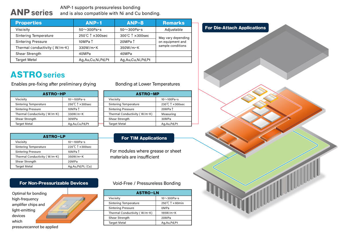 By employing uniquely engineered nano-silver particles, it achieves reliable bonding not only with noble metals such as Ag and Au, but also with base metals such as Cu and Ni.